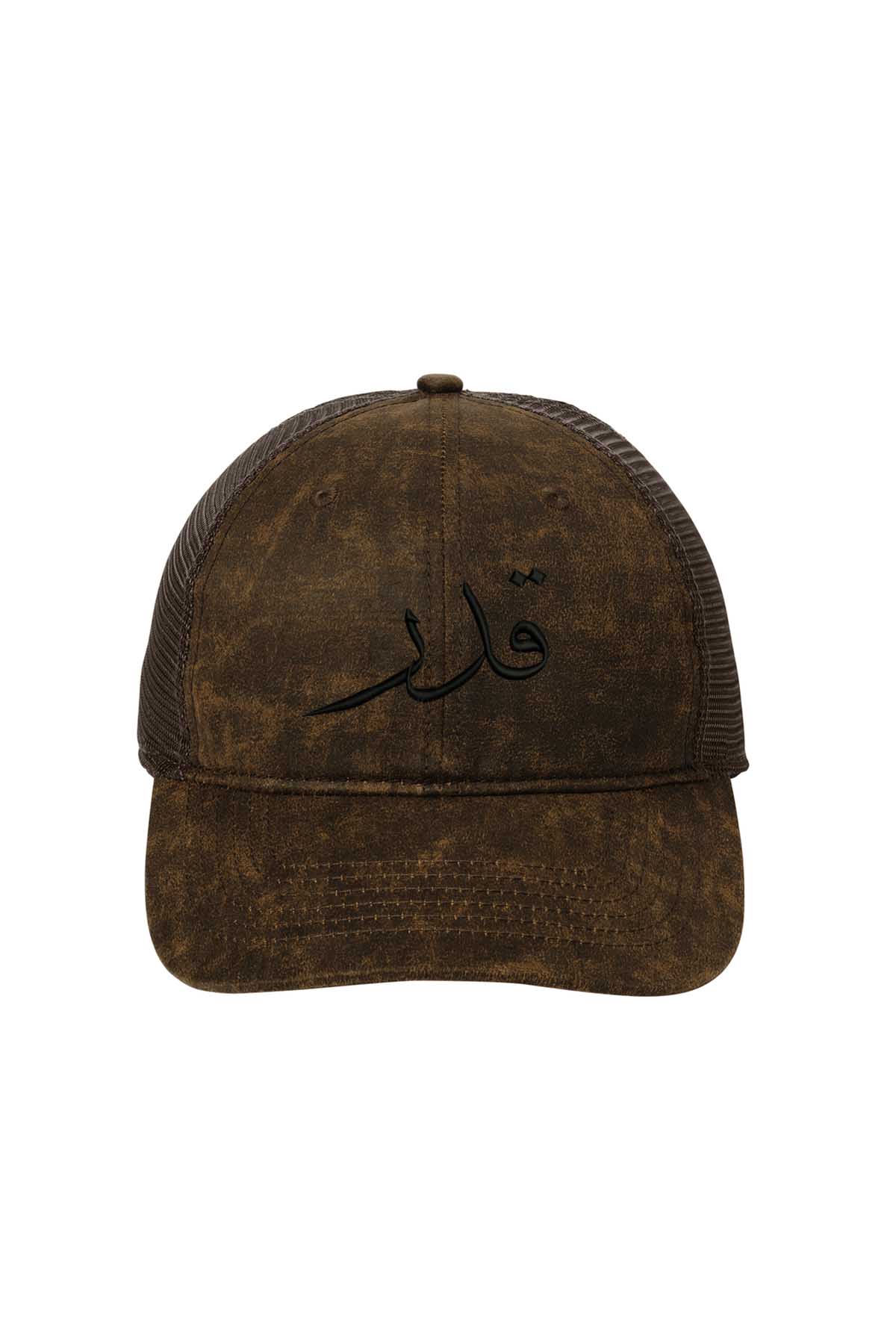 The Destiny Vintage Trucker Cap is a brown low-profile trucker hat featuring Arabic embroidery on the front panel. The front design includes the word قدر, giving the cap a clean Arabic-led look with a simple and direct visual identity.