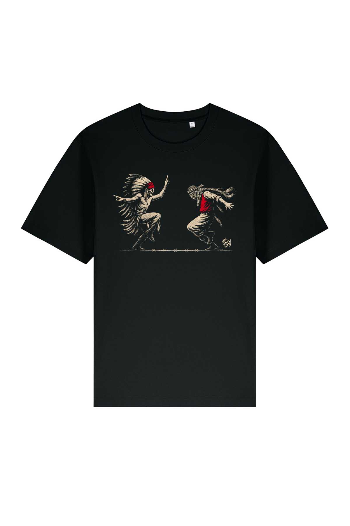 The Indigenous Solidarity Tee is a premium black graphic t-shirt designed with a cultural solidarity artwork featuring two dancers on the front. The design is centered on a clean black base, creating a strong visual contrast while keeping the overall look simple and easy to wear.