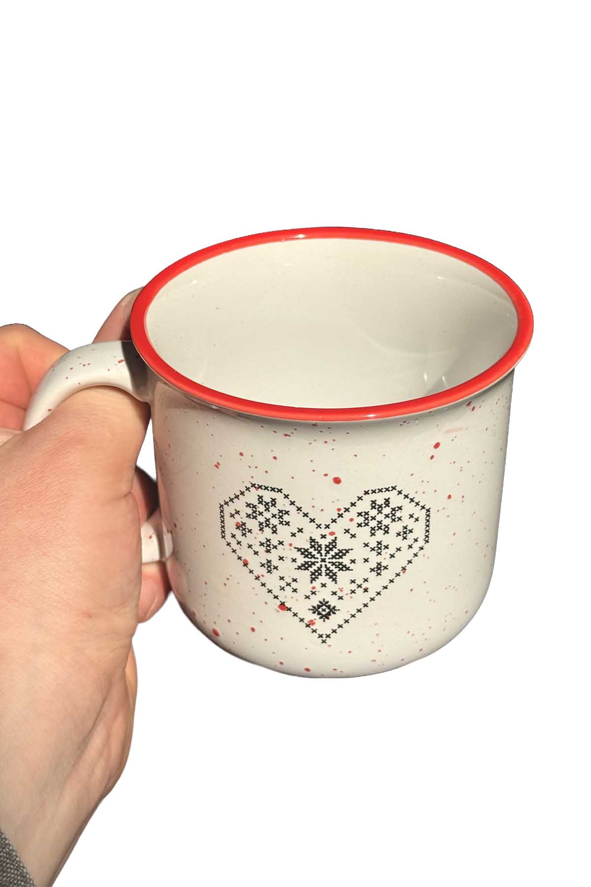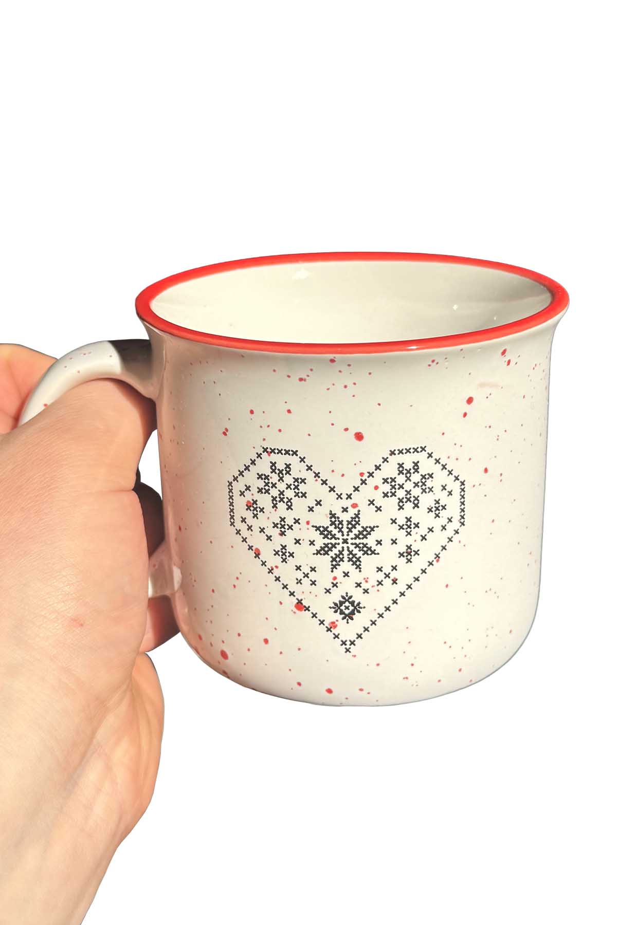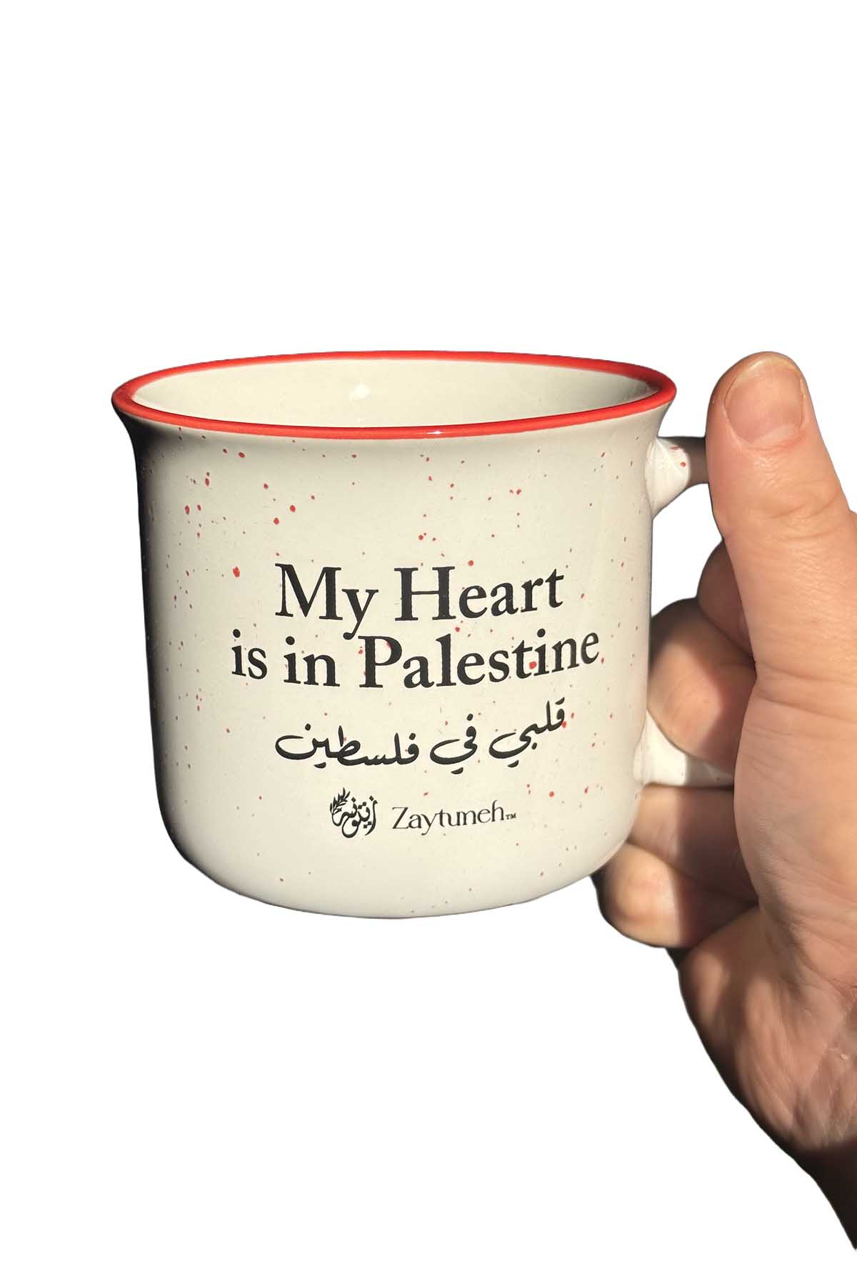 The My Heart is in Palestine Mug is a ceramic camp-style mug designed for everyday coffee, tea, and warm drinks. It features the phrase My Heart is in Palestine on one side with the Arabic قلبي في فلسطين below it, and a heart motif on the reverse side inspired by traditional cross-stitch detailing.
