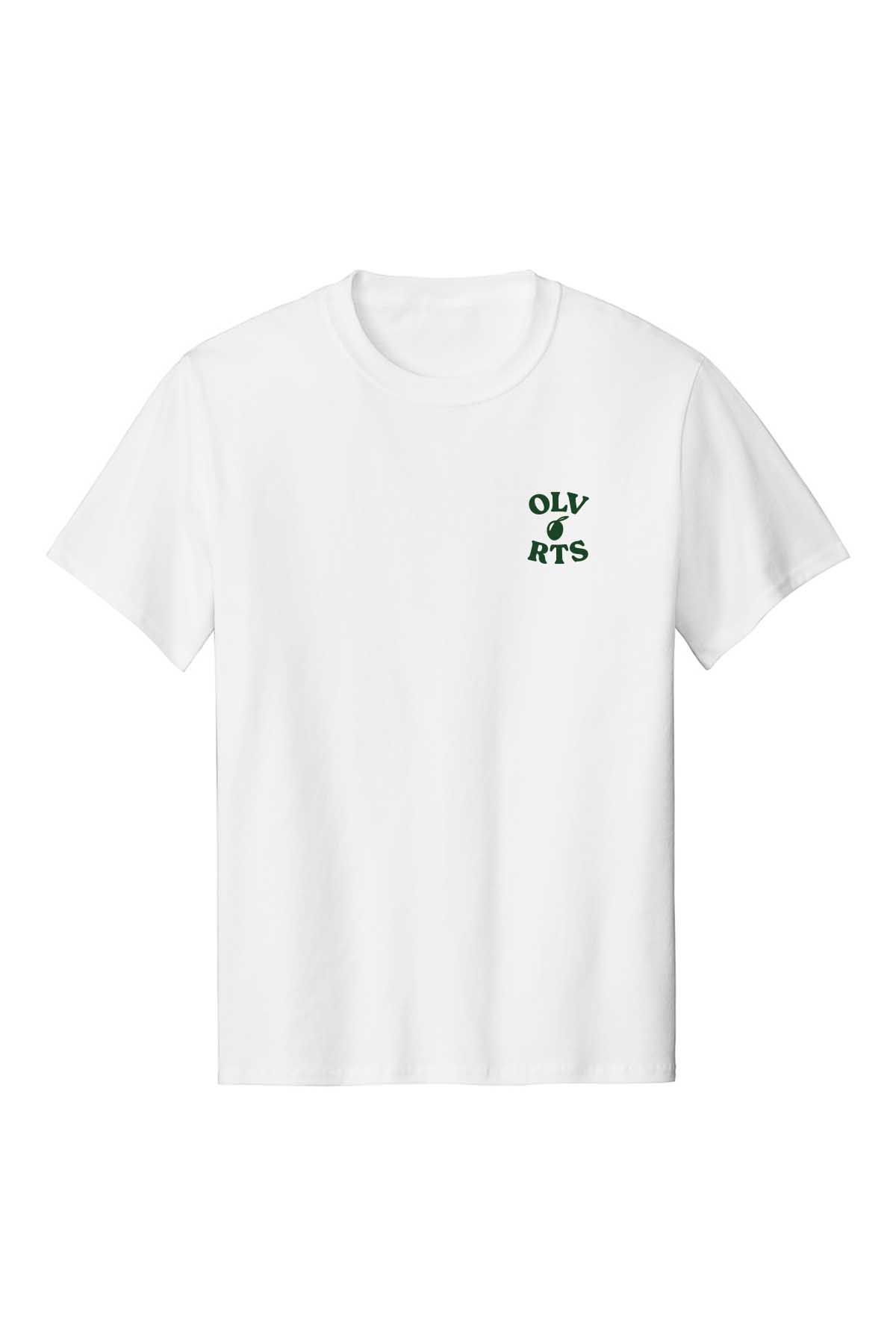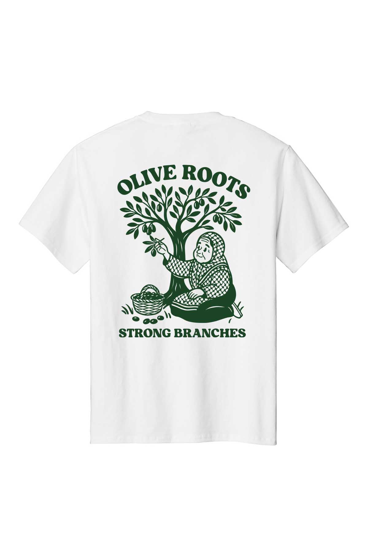 The Olive Roots Strong Branches Tee is a white graphic t-shirt designed for everyday wear. It features a small front chest print and a larger back graphic with Olive Roots Strong Branches text and an illustrated olive harvest scene.