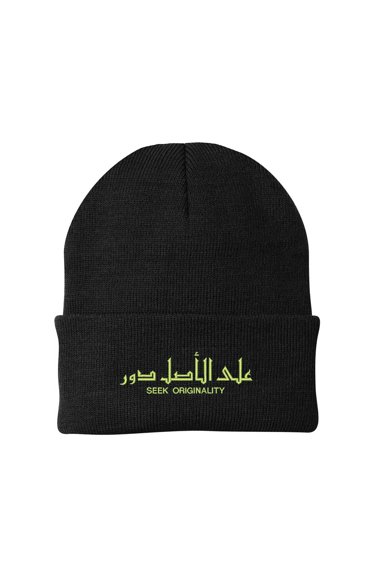 The Seek Originality Beanie is a black cuffed knit hat designed for cooler weather and everyday wear. It features embroidered English and Arabic text on the front, with Seek Originality placed below عِندَ الأَصَالَة دَوِّر, giving the design clear bilingual visibility.