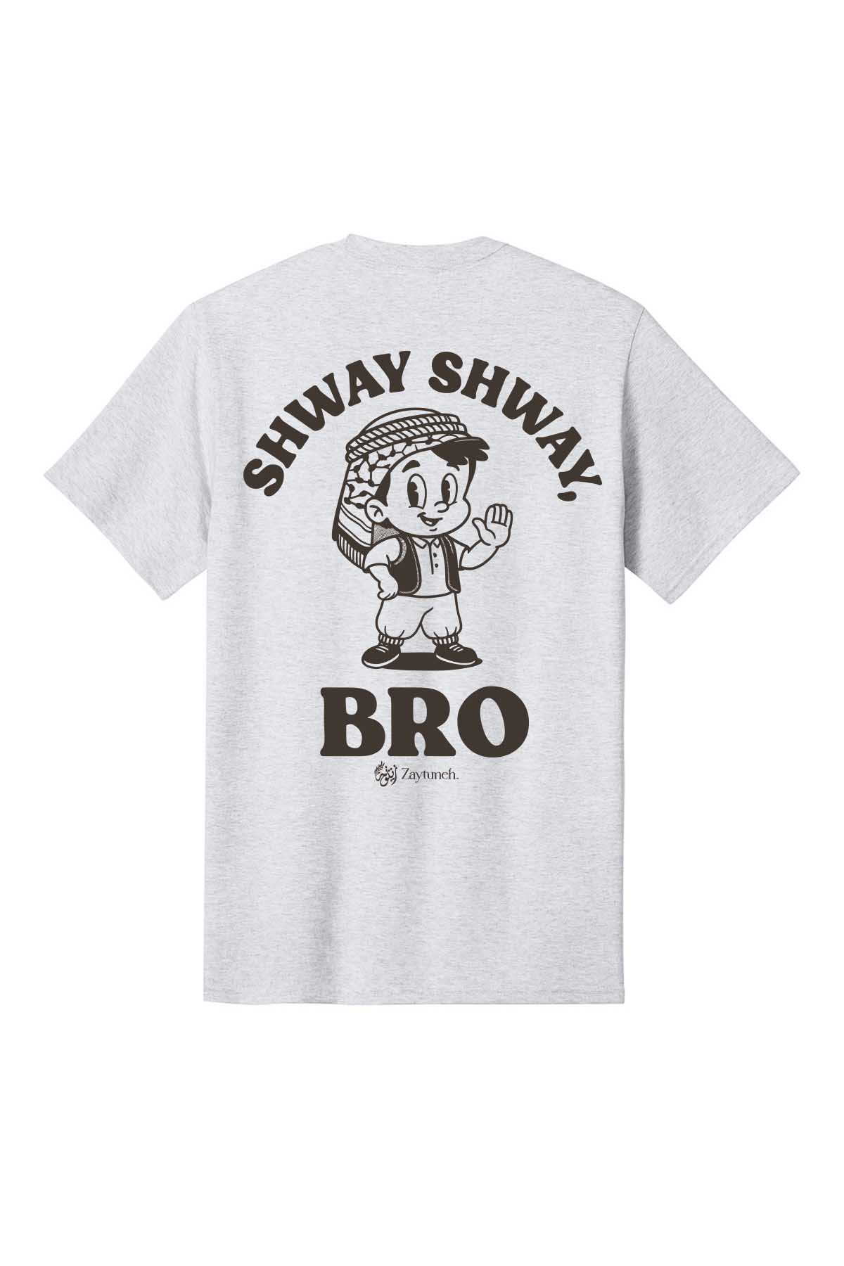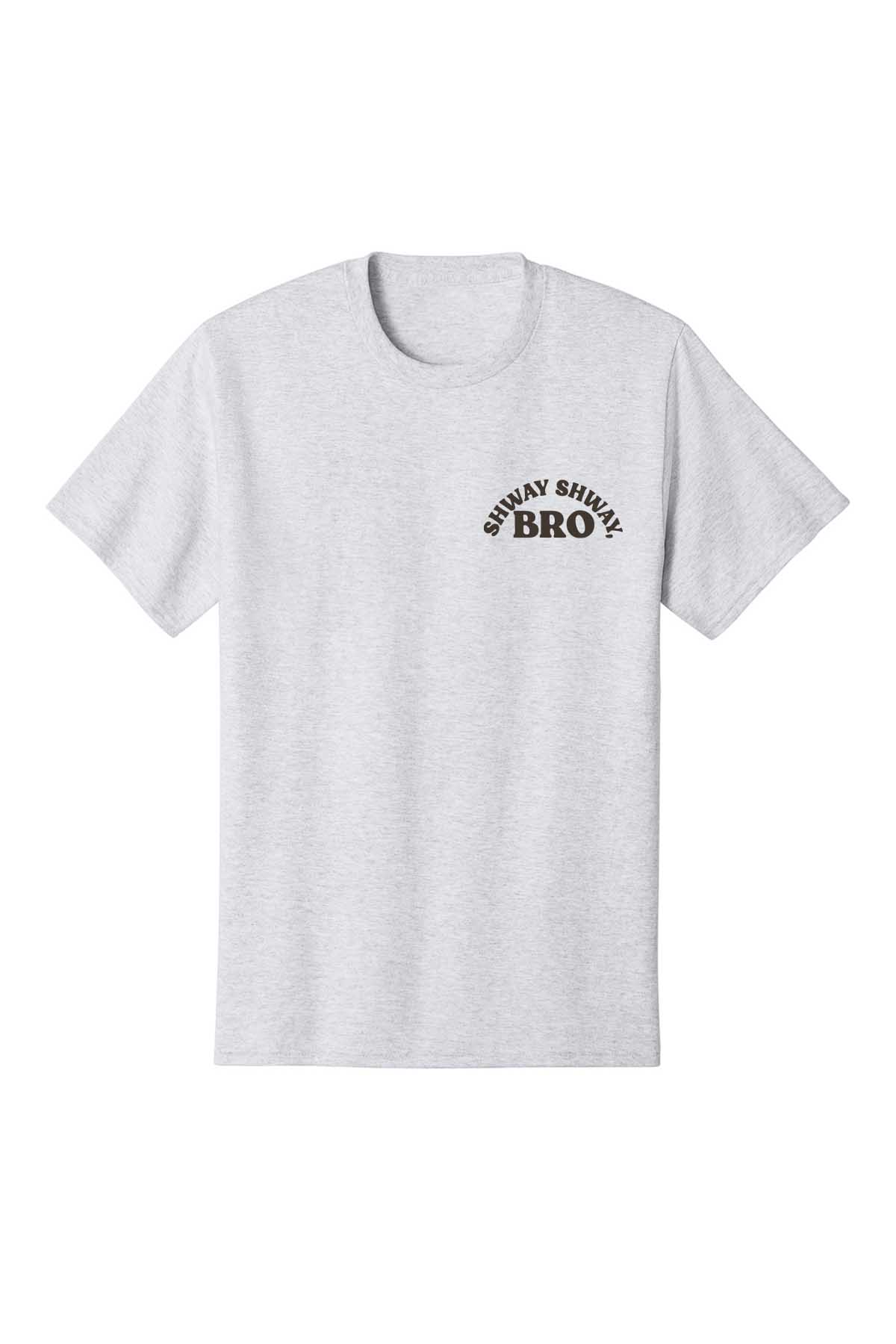 The Shway Shway, Bro Tee is an ash grey graphic t-shirt designed for everyday wear. It features a small front chest print and a larger back graphic with the Shway Shway, Bro design, creating a clear front-and-back layout with a strong visual identity.