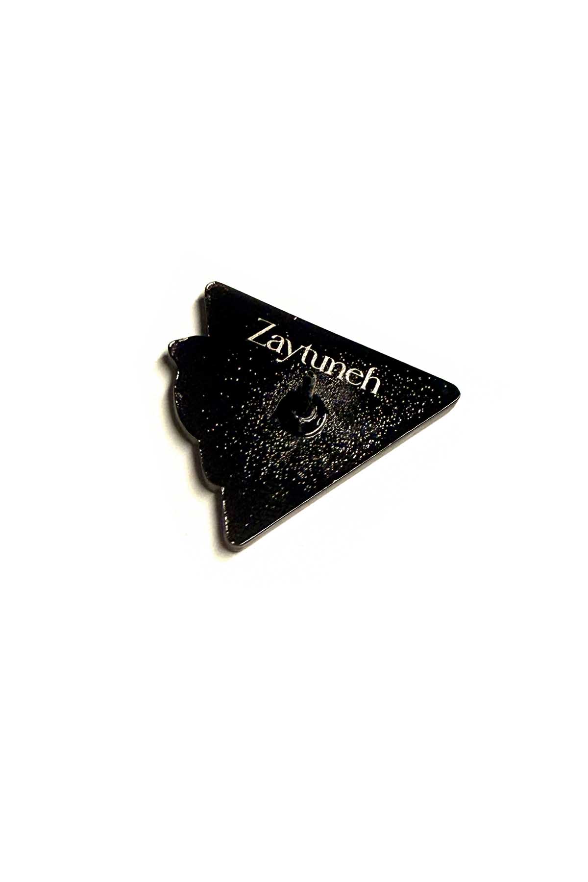 The Triangle Dove Pin is an enamel lapel pin designed by Zaytuneh. It features a white dove layered over a red triangle shape with a polished dark metal outline, creating a clean, high-contrast design in a compact size.