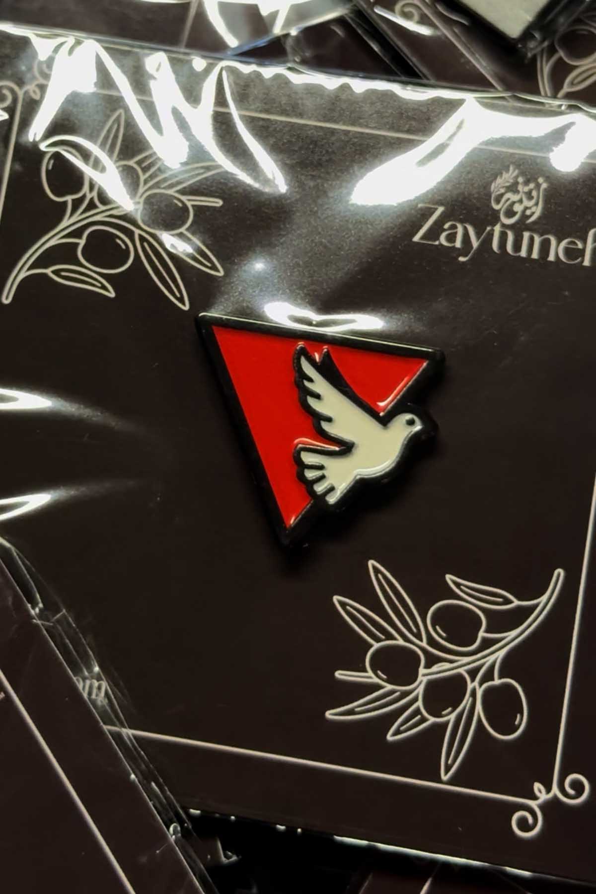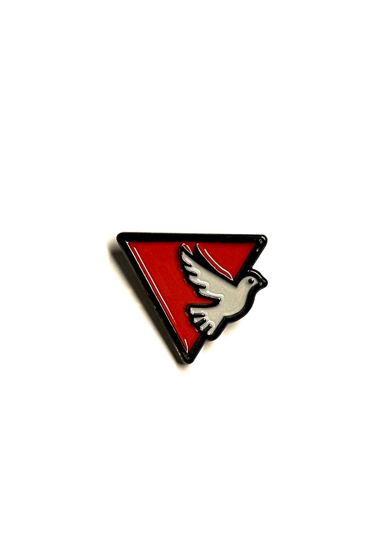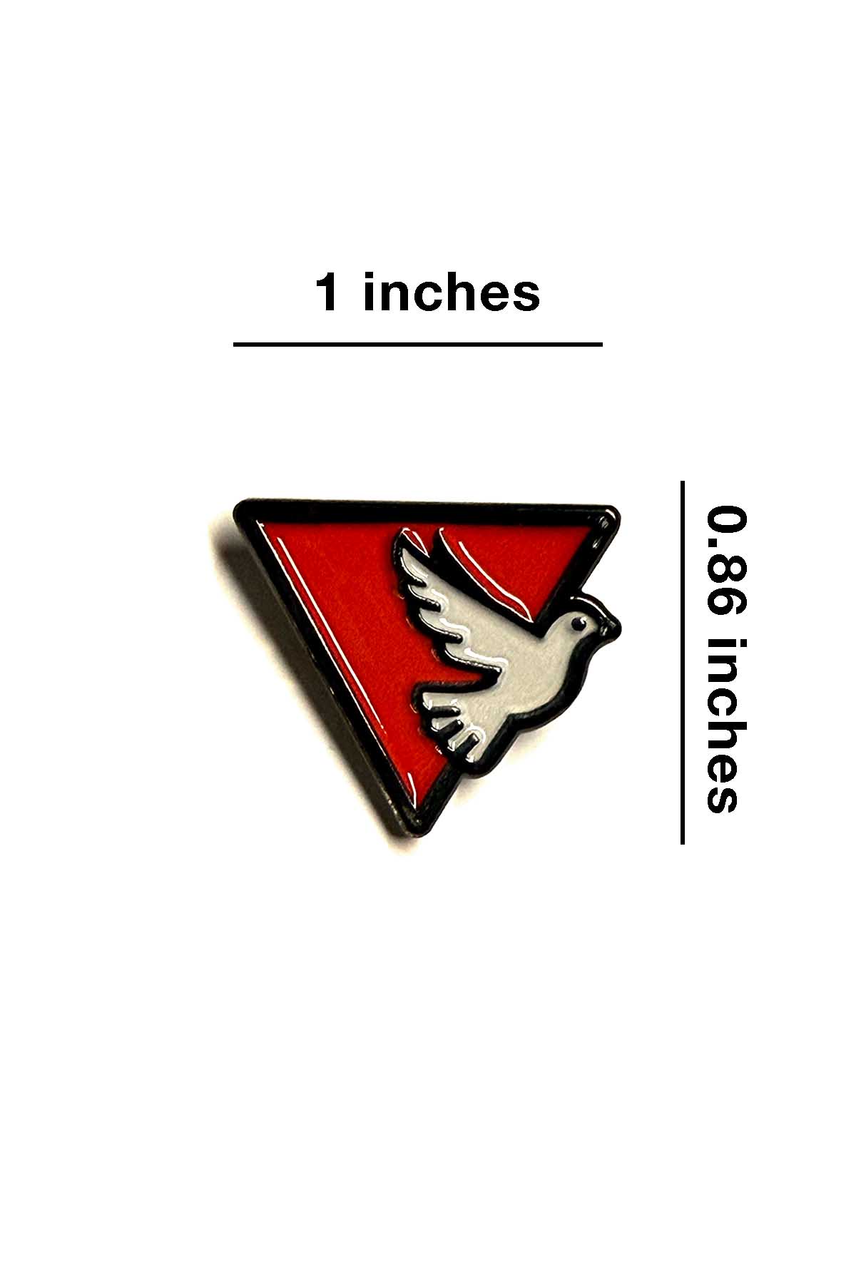 This pin is made as a small statement accessory for jackets, tote bags, hats, backpacks, lanyards, and pin collections. The dove graphic gives the design a clear visual identity, while the red triangle background adds strong contrast and keeps the shape easy to recognize.